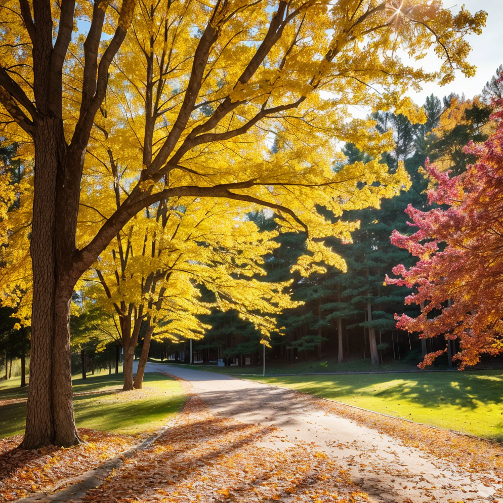 고목의 그림자와 단풍잎이 섞인 바닥은 패턴처럼 보이며, 바람에 흔들리면 색채가 흩어집니다. 새소리와 낙엽 밟는 소리가 가을 리듬과 조화를 이룹니다.